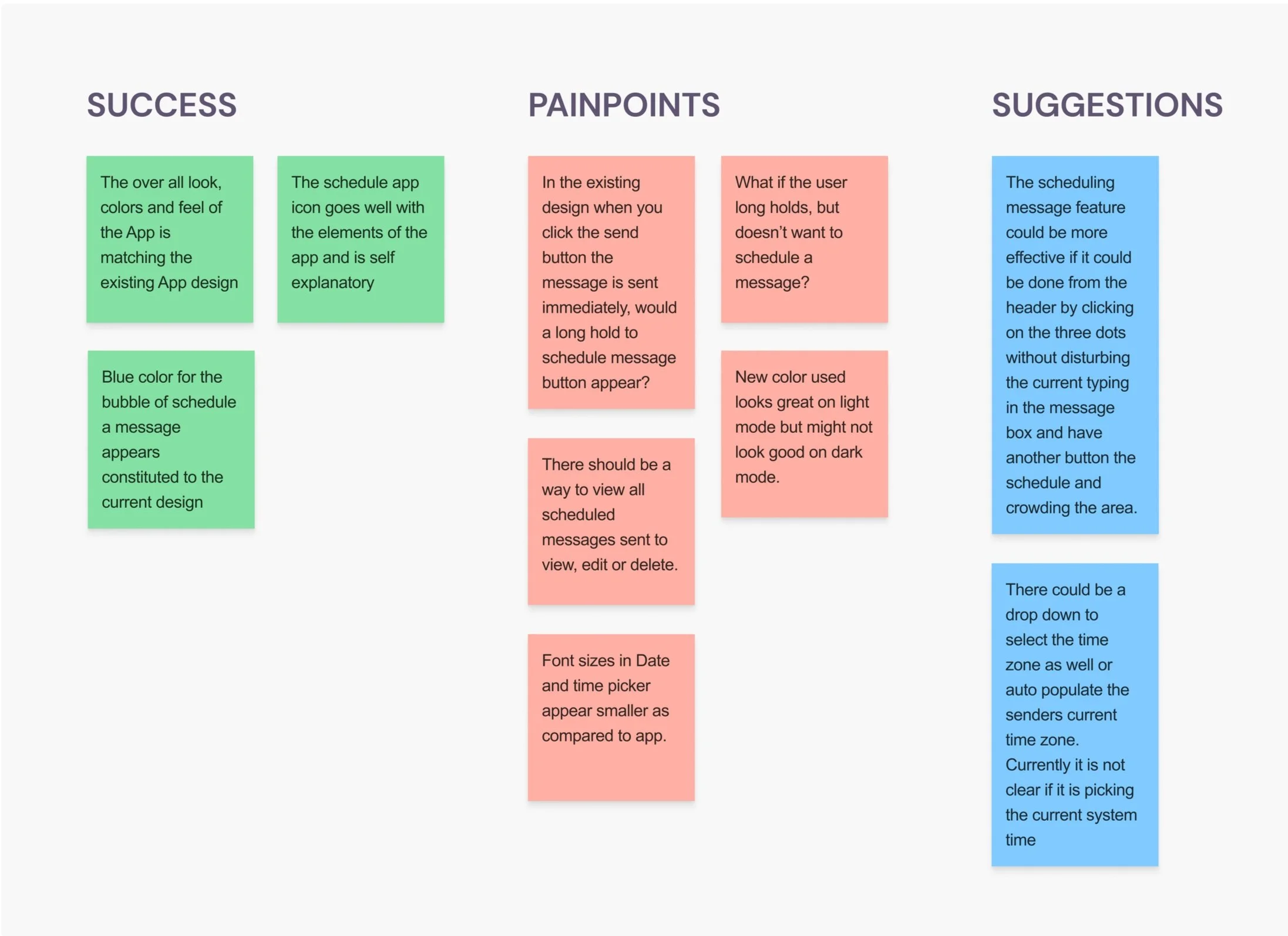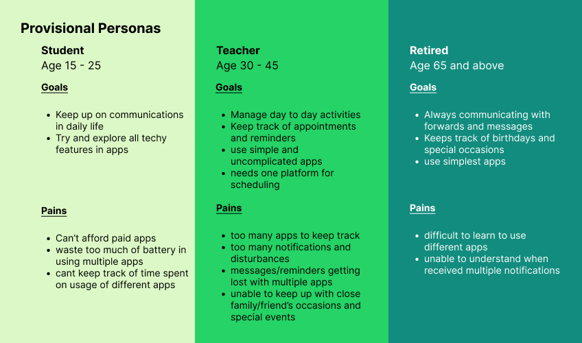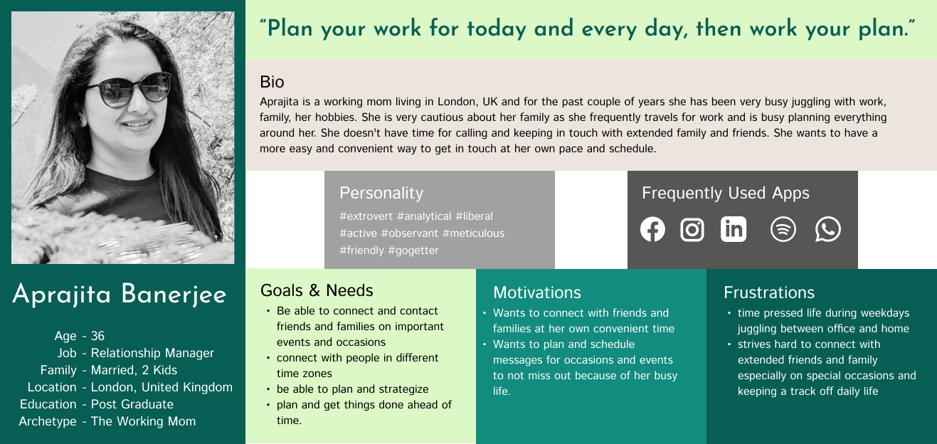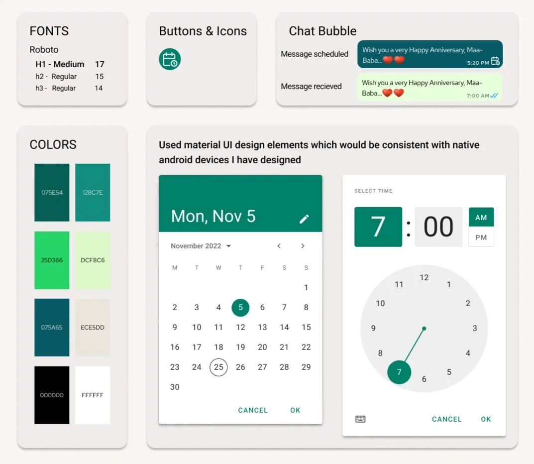 After researching, representing a major user group for the app helped me build the User Persona . It aided to express and focus on the needs and expectations of the most important user groups, giving a clear picture of how they're likely to use the feature of scheduling a message that I am going to add to the app.