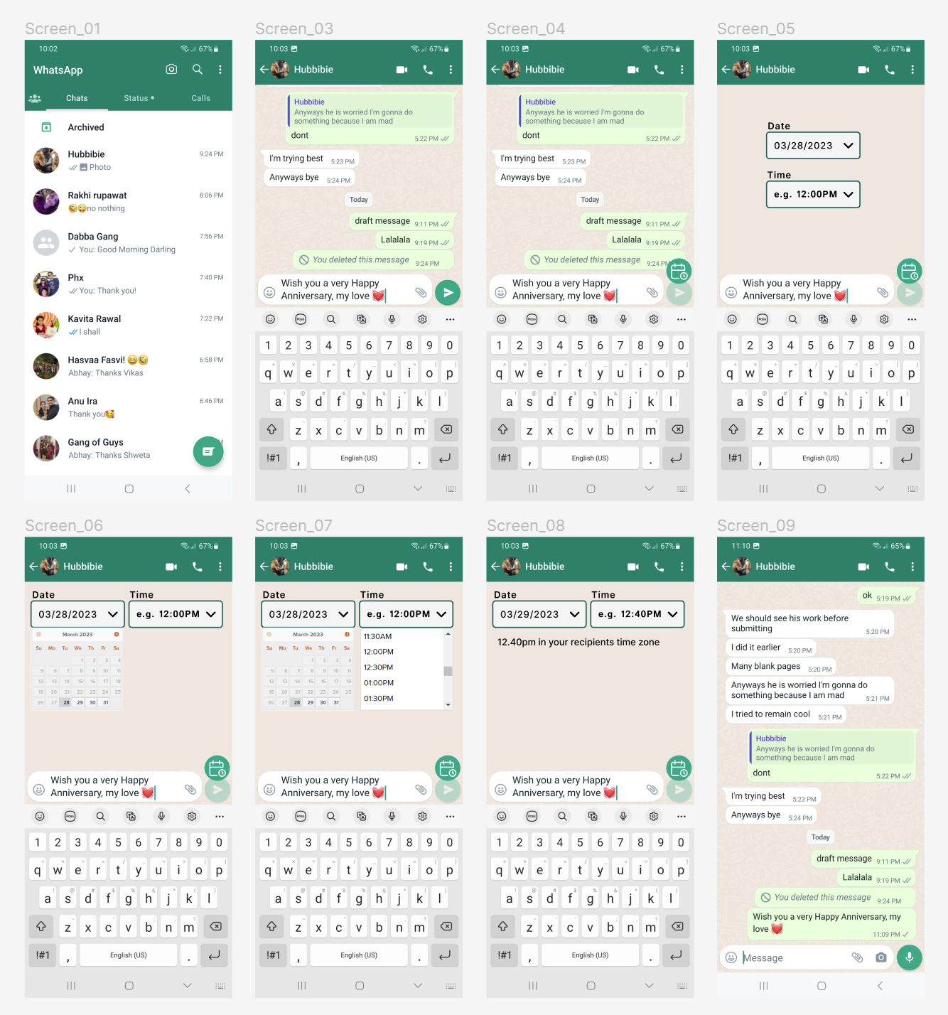The goal of this project was to add a feature of scheduling a message using Whatsapp! The feature allows to draft and schedule messages in advance by setting a date and time easily. It was an amazing experience considering the market research, it gave an opportunity to understand the costs associated with the competitors apps and how Whatsapp can do it for free. From the design prospective sticking to the existing brand was quite challenging.